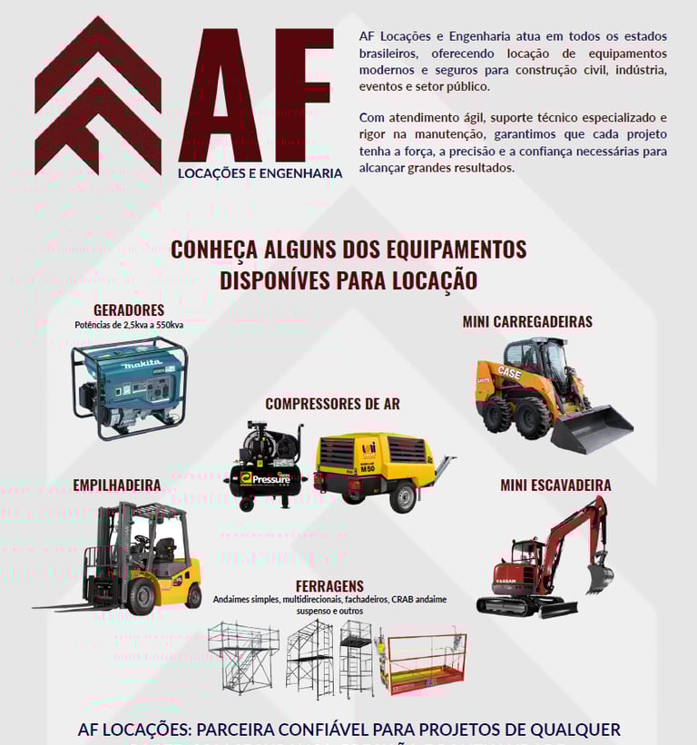 Com atendimento ágil, suporte técnico especializado e rigor na manutenção dos nossos ativos, garantimos que cada projeto tenha a força, precisão e a confiança necessárias para alcançar grandes resultados.